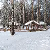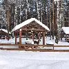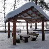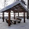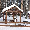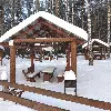 Средняя беседка. Комфортный деревянный стол и лавки из бревен. Удобный большой мангал. Освещение. Электричество