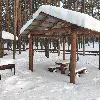 Маленькая беседка. Комфортный деревянный стол и лавки из бревен. Удобный большой мангал. Освещение. Электричество