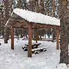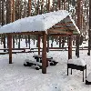Маленькая беседка. Комфортный деревянный стол и лавки из бревен. Удобный большой мангал. Освещение. Электричество