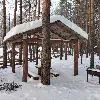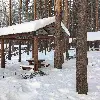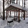 ММаленькая беседка. Комфортный деревянный стол и лавки из бревен. Удобный большой мангал. Освещение. Электричество