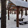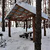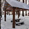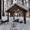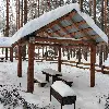 Маленькая беседка. Комфортный деревянный стол и лавки из бревен. Удобный большой мангал. Освещение. Электричество
